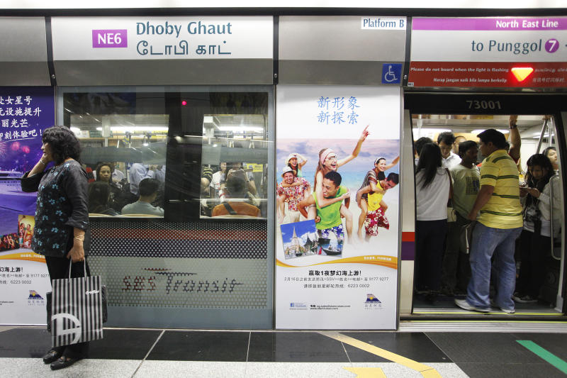 Commuters getting into a train at the Dhoby Ghaut MRT station on the North East Line.