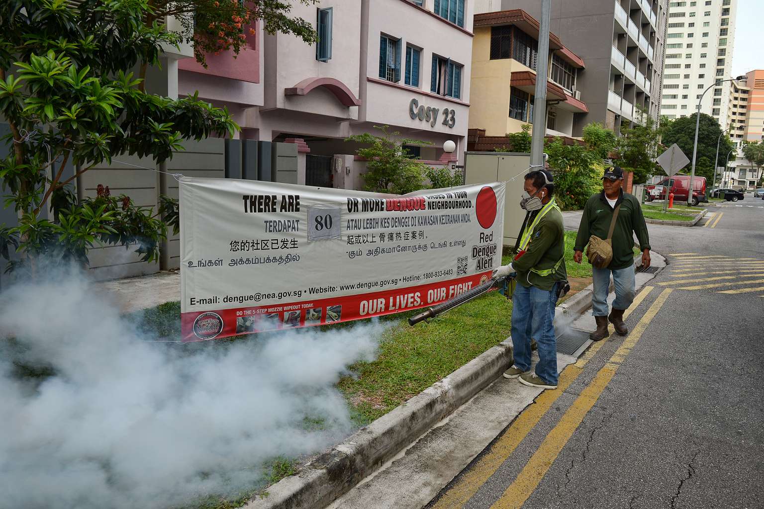 Workers contracted by the NEA carry out fogging at Lorong 30 Geylang to fight against dengue in the area.
