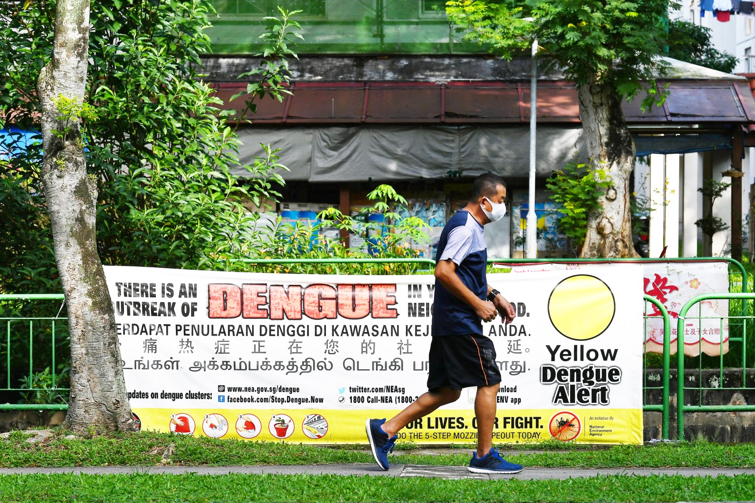 A dengue alert banner in Bukit Batok. The outbreak in Singapore may top previous records partly because more people are staying home due to the circuit breaker, providing more blood meals for Aedes mosquitoes.