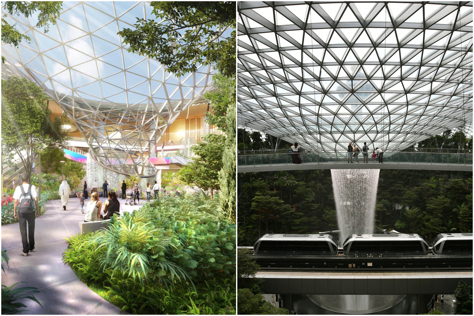 The expansion plans for Qatar's Hamad International Airport feature an indoor waterfall and massive gardens (left) that are strikingly similar to what Jewel Changi Airport offers.