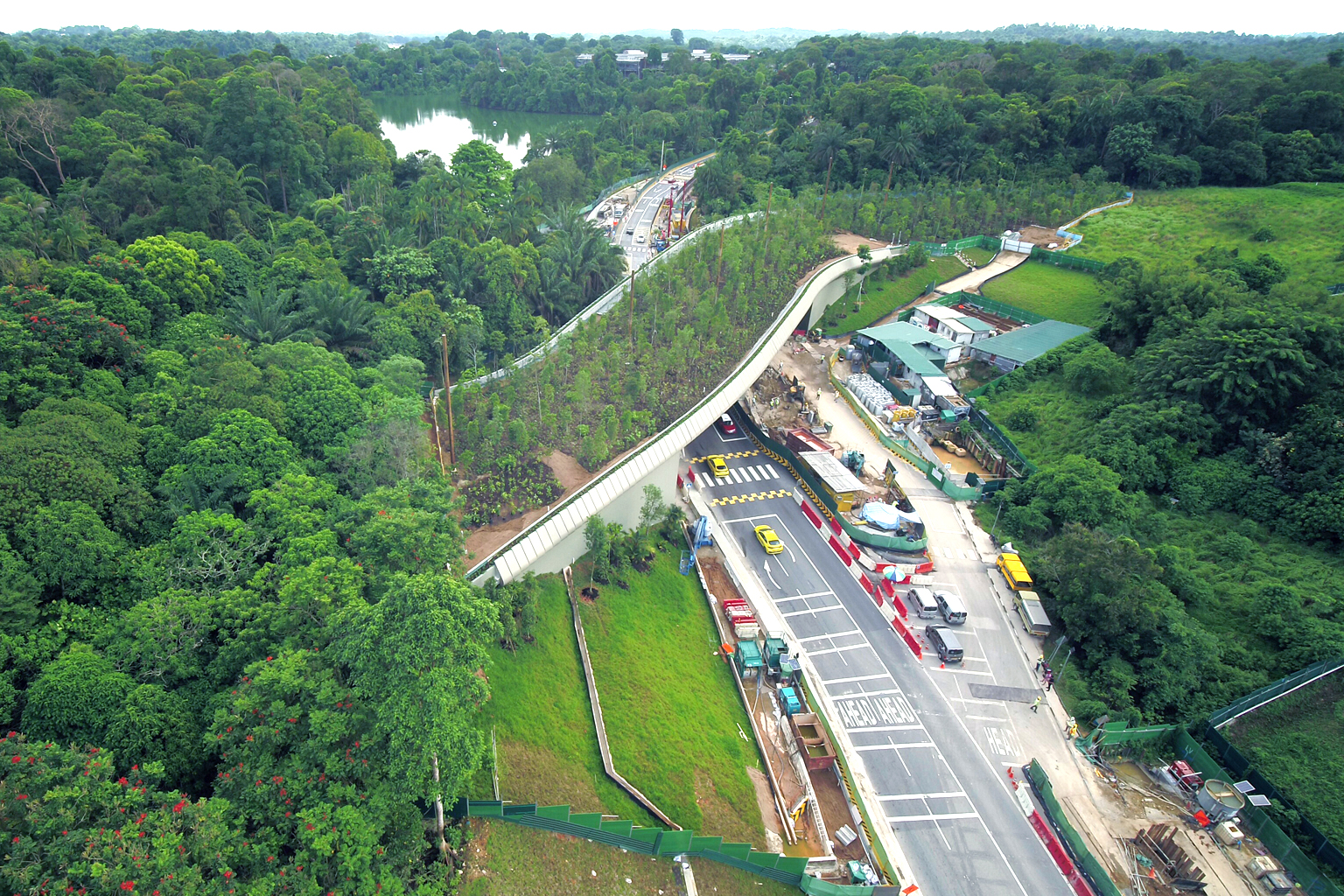 A new 44m-wide and 110m-long wildlife bridge across Mandai Lake Road enables native animals to cross between the CCNR’s northern and southern parts safely. During its construction, easier-to-install artificial crossing aids, such as connectivity poles on both sides of the road with rope bridges strung across them, were put up to help tree-dwelling and gliding animals move across.