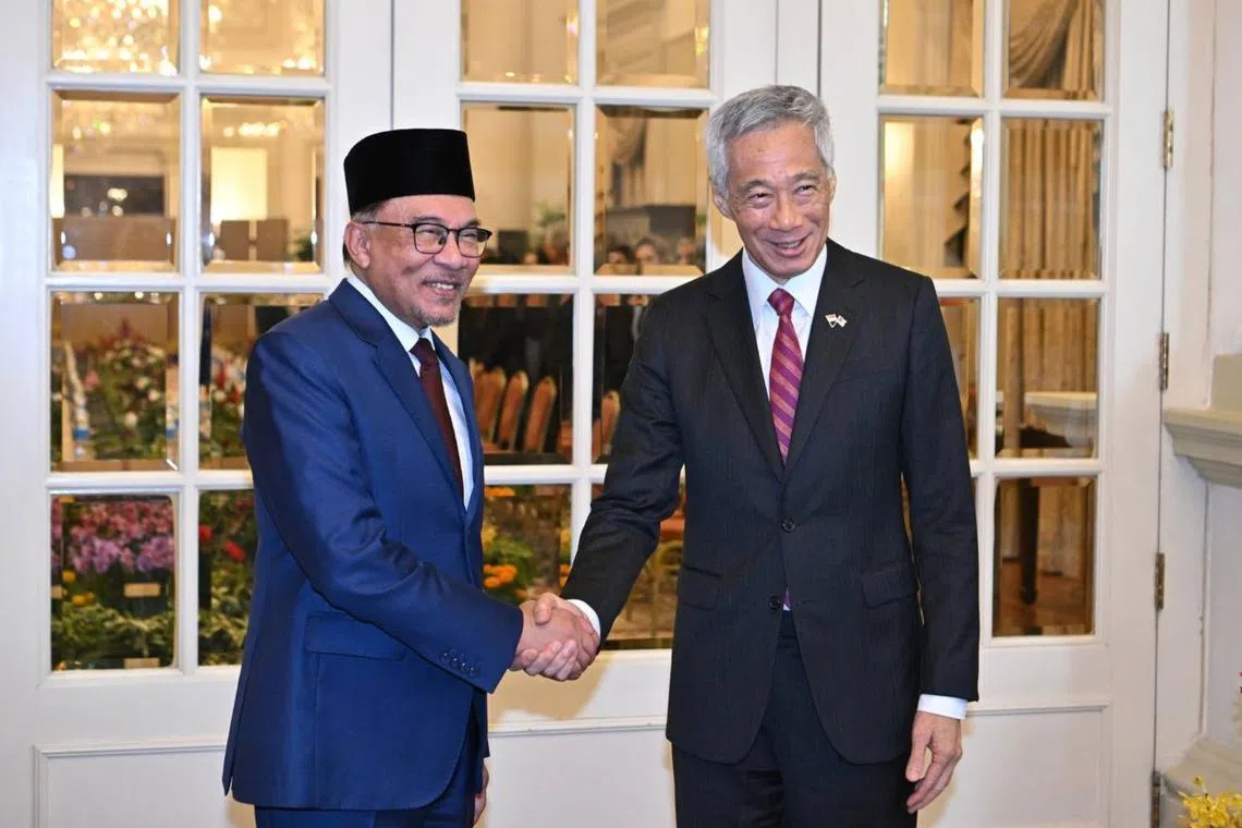 Malaysian Prime Minister Anwar Ibrahim meeting Prime Minister Lee Hsien Loong at the Istana on Monday.