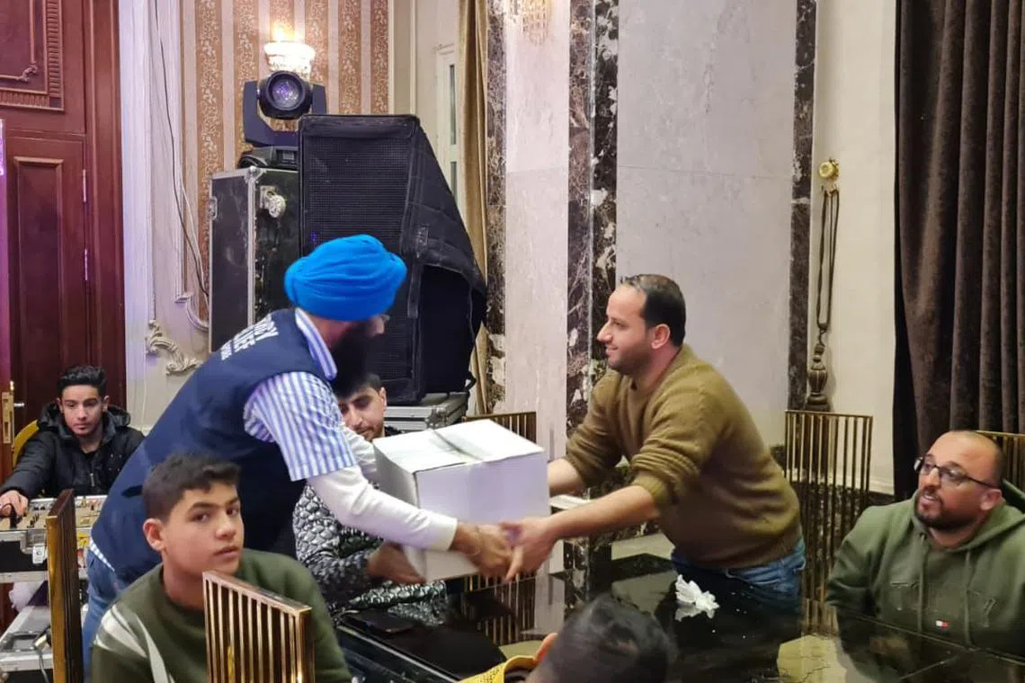 Mercy Relief chairman Satwant Singh handing over a food package to a refugee in Cairo on March 16.