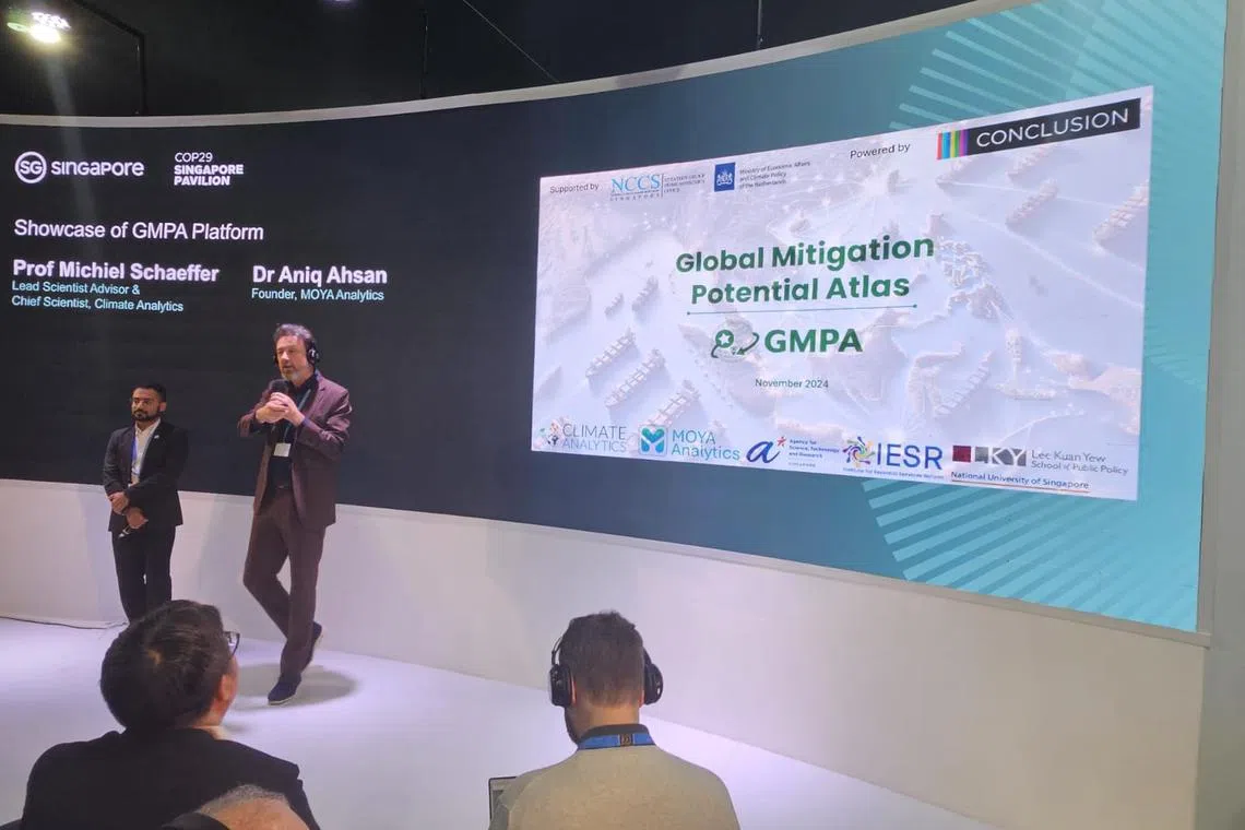 Dr Aniq Ahsan (left) and Dr Michiel Schaeffer, lead science adviser at Climate Analytics, making a presentation on the atlas at the Singapore Pavilion at COP29 in November.