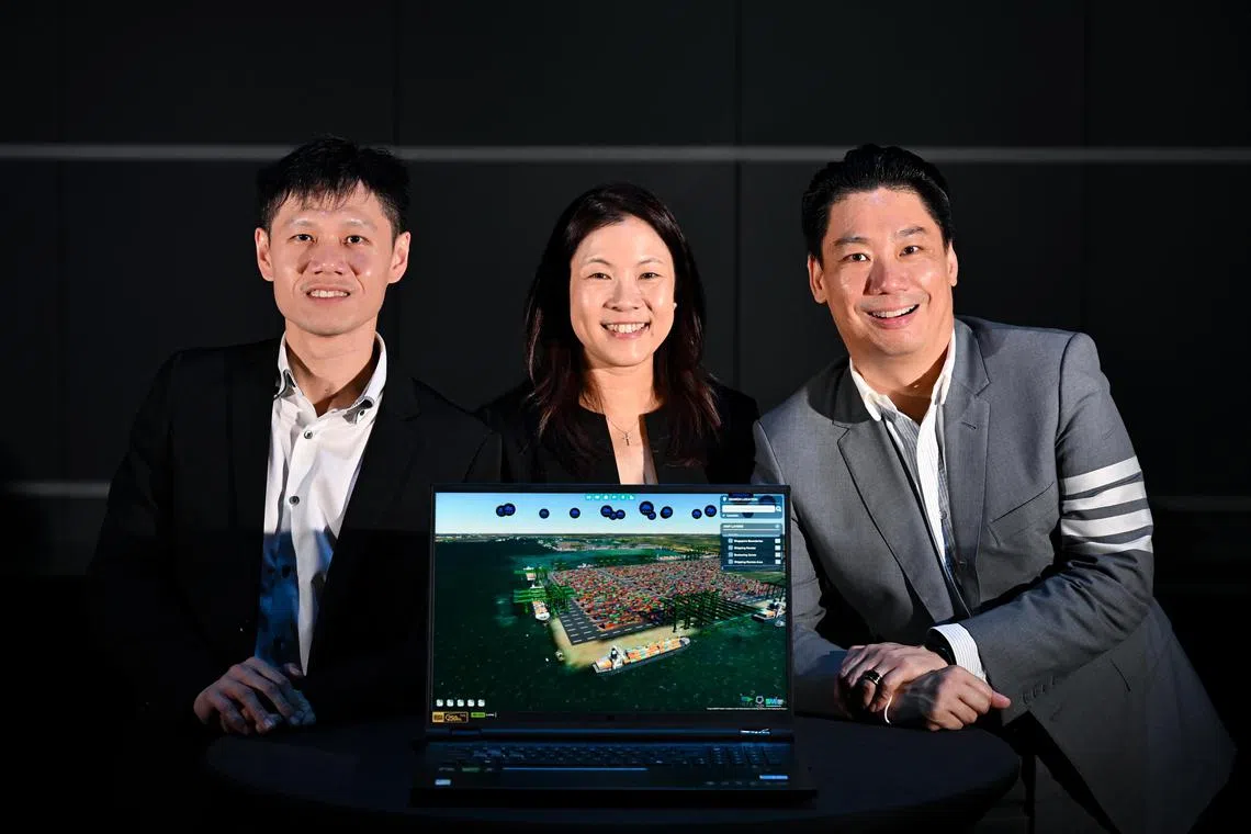 (From left) Mr Ho Yenn Jie, 36, assistant director of the Smart City Technology Division at GovTech Singapore; Ms Karen Kee Tze Ling, 45, deputy executive director and head of digital translation at Singapore Maritime Institute; and Mr Lester Kum, 45, deputy director of development and innovation for tech productisation and operations at the Maritime and Port Authority of Singapore, have been developing the Singapore port’s digital twin since 2024.