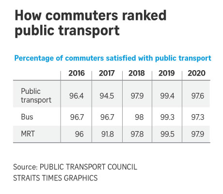 "Commuters continued to be satisfied with public transport in 2020... even though the proportion of commuters who gave a score of six and above dipped from 99.4 per cent in 2019 to 97.6 per cent in 2020," the PTC said.