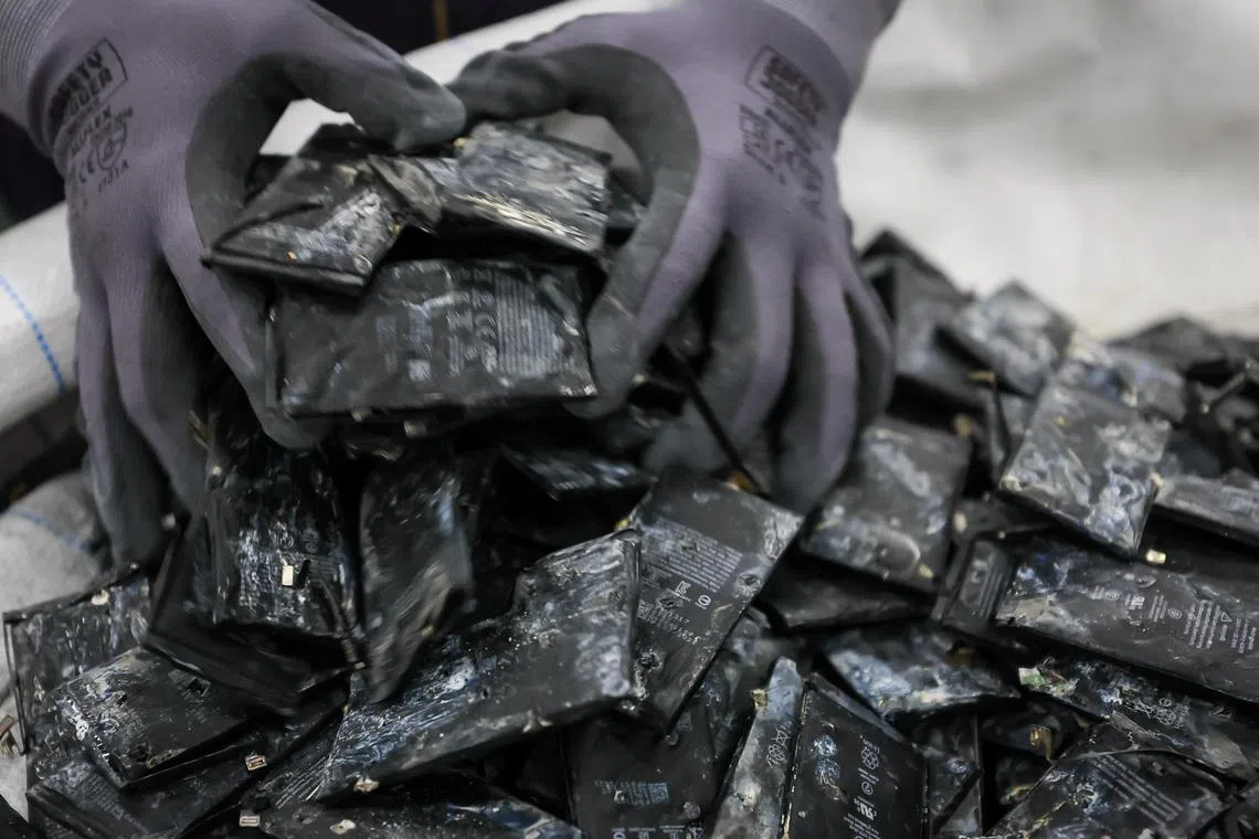 Loose mobile phone batteries at the TES Singapore battery recycling facility in Tuas.