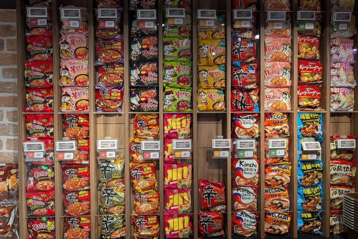 Variety: The variety of noodles here, around 10 types of noodles, was more limited than the other places we visited. The selection comprised mostly Korean favourites such as Nongshim Shin Ramyun and Samyang’s Buldak Hot Chicken Ramyun. There were also few toppings, including egg, cheese, kimchi and Spam. Shelves were not labelled.
