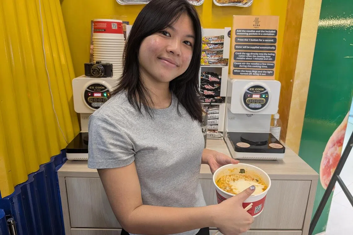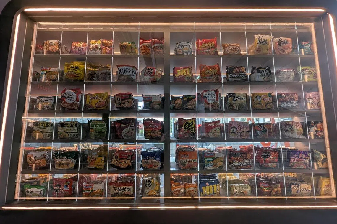 Variety: We counted around 25 types of instant ramen in the vending machine, including popular ones such as Nongshim Shin Ramyun, Ottogi Jin Ramyun, Maggi noodles and Indomie Mi Goreng. The selection also included local brand Irvins’ Salted Egg Mala and Spicy Salted Egg flavours. The vending machine slots were labelled to indicate if the noodles were spicy, recommended or halal. There was no labelling for vegetarian options.