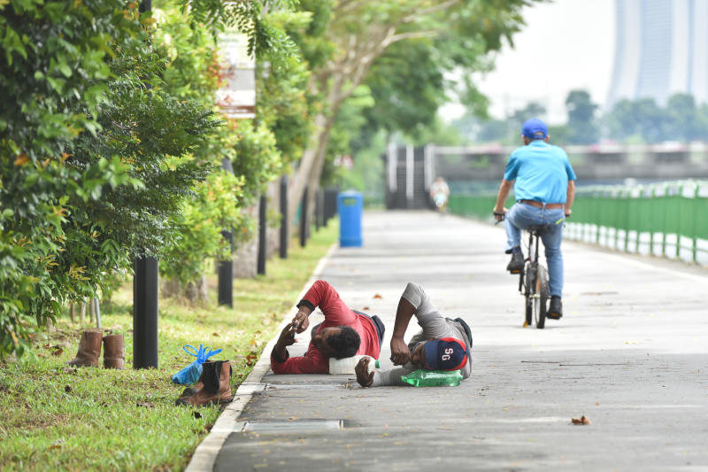 Foreign workers rest on a park connector along Geylang River on Oct 12, 2018.