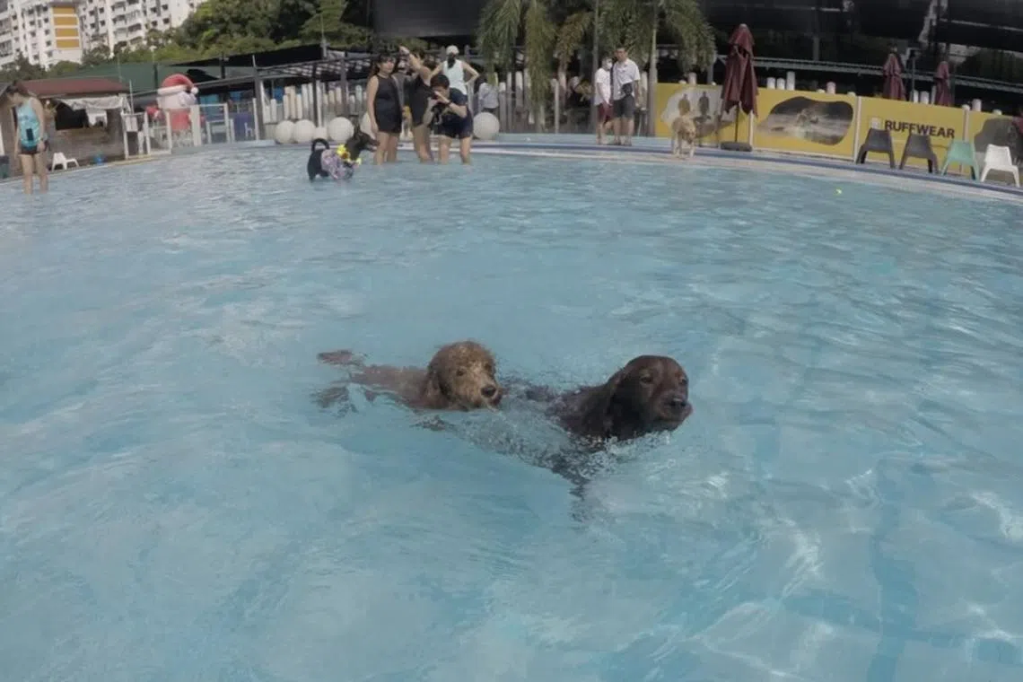 Ms Janice Tham’s maltipoo Latte and cockapoo Mocha (left) enjoying a swim in the pool on March 31.