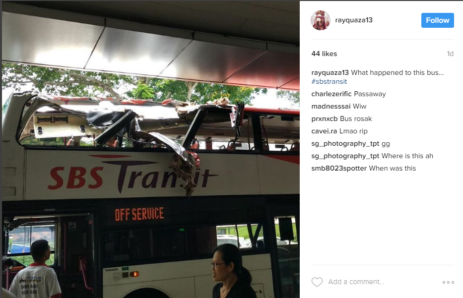 A photo posted on Instagram by user @rayquaza13 on Sunday (April 2) shows the top of the SBS Transit double decker bus severely damaged, with parts of its roof scraped off.