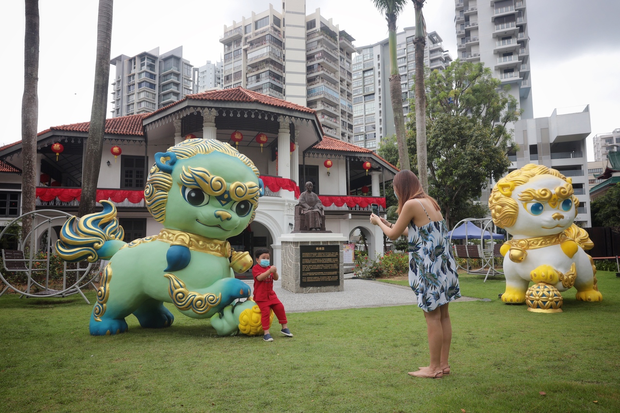 SINGAPORE - Two large "rui shi", or guardian lions, have been installed on the lawn of the Sun Yat Sen Nanyang Memorial Hall in Balestier to mark the start of its annual festival welcoming the Chinese New Year.