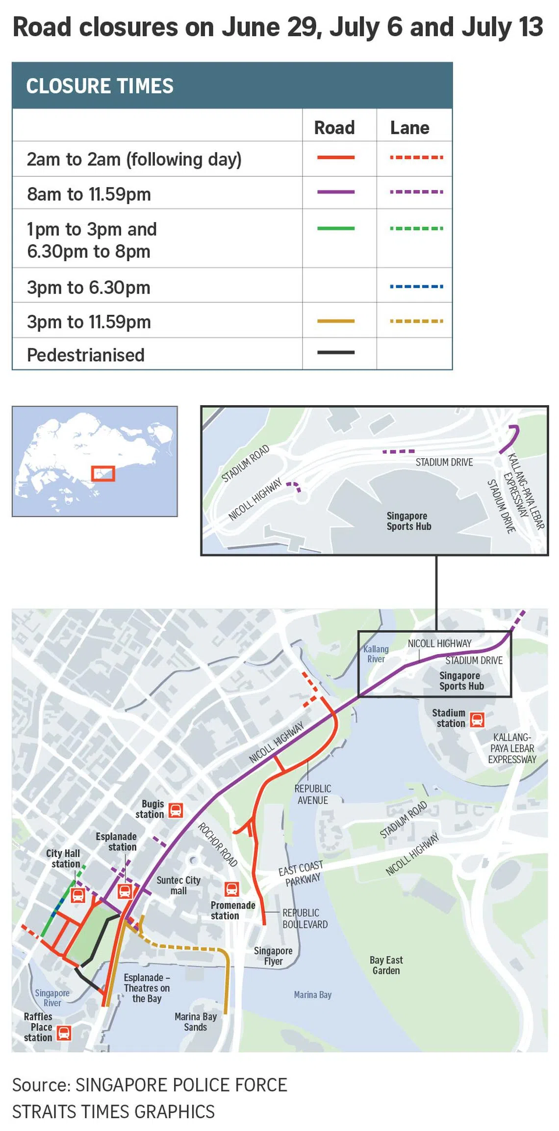 A number of SBS Transit bus services plying the city area will also be affected on June 29, July 6 and July 13. They will travel along alternative routes and skip bus stops in Nicoll Highway, Marina Bay and those in the vicinity of the Civic District.