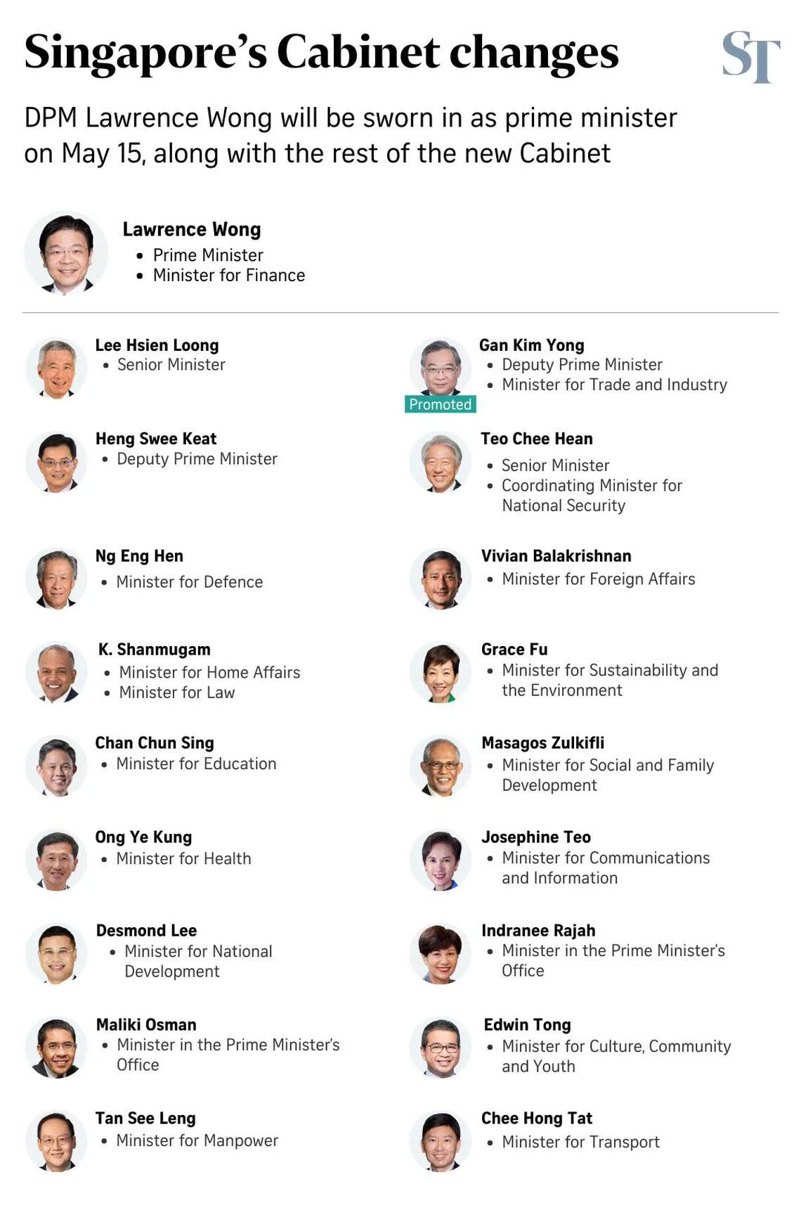 This means Mr Teo Chee Hean, 69, will remain Senior Minister and Coordinating Minister for National Security; Dr Ng Eng Hen, 65, will remain Defence Minister; Mr K. Shanmugam, 65, will stay on as Home Affairs and Law Minister; and Dr Vivian Balakrishnan, 63, will continue as Minister for Foreign Affairs.