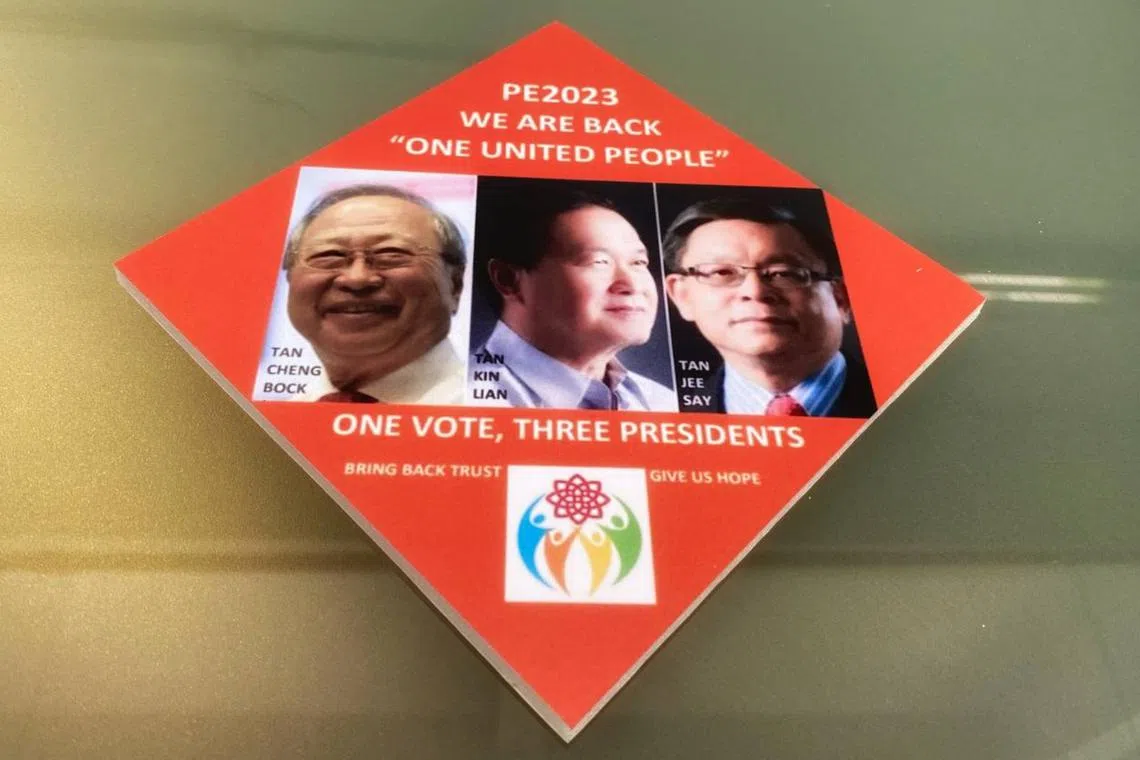 A poster with the photos of Dr Tan Cheng Bock, presidential candidate Tan Kin Lian and Mr Tan Jee Say seen in Chin Swee Road on Aug 27.