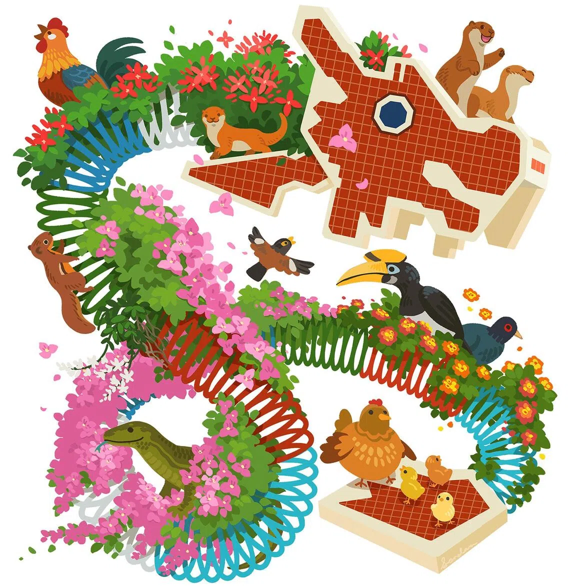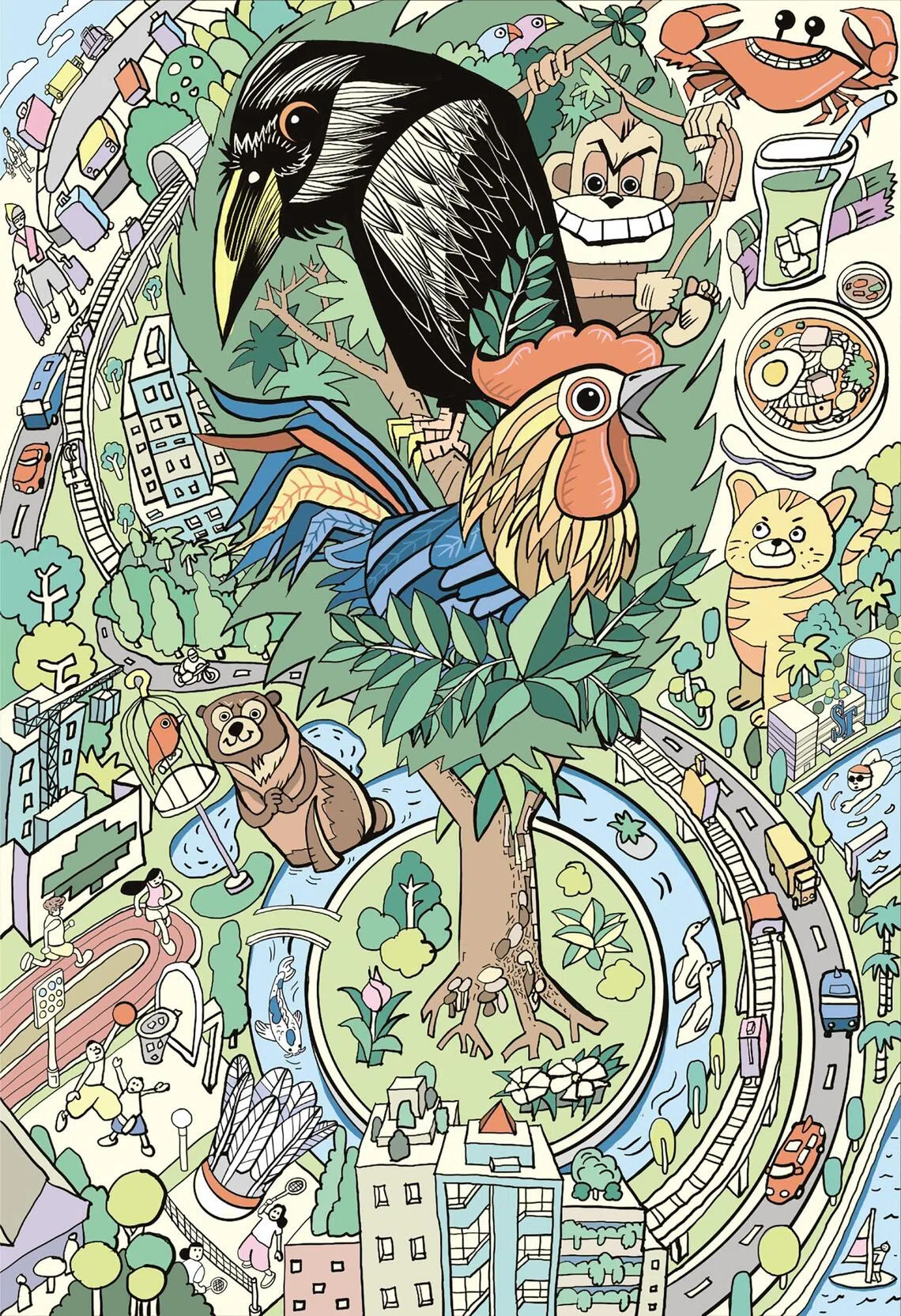 The iconic dragon fixture from one of the last remaining old-school playgrounds, in Toa Payoh, is the centrepiece of 46-year-old illustrator Sandara Tang’s winning submission. Its coiled body is festooned with blooms, in a nod to Singapore’s “garden city” nickname.