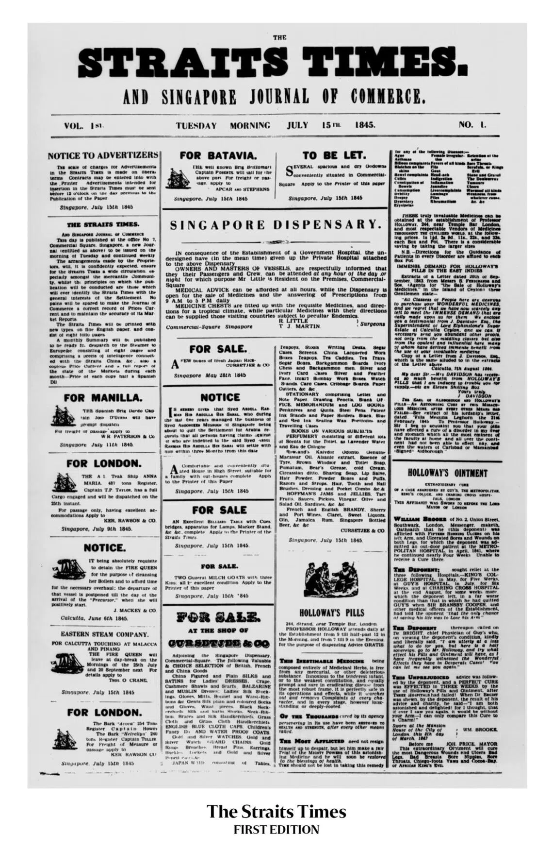 ST’s original T-shirt designs include a print of the very first issue of Singapore’s paper of record, published on July 15, 1845. It featured not news, but descriptions of the publication, notices and advertisements on the front page. A translated excerpt from a book on French history went over pages five and six.