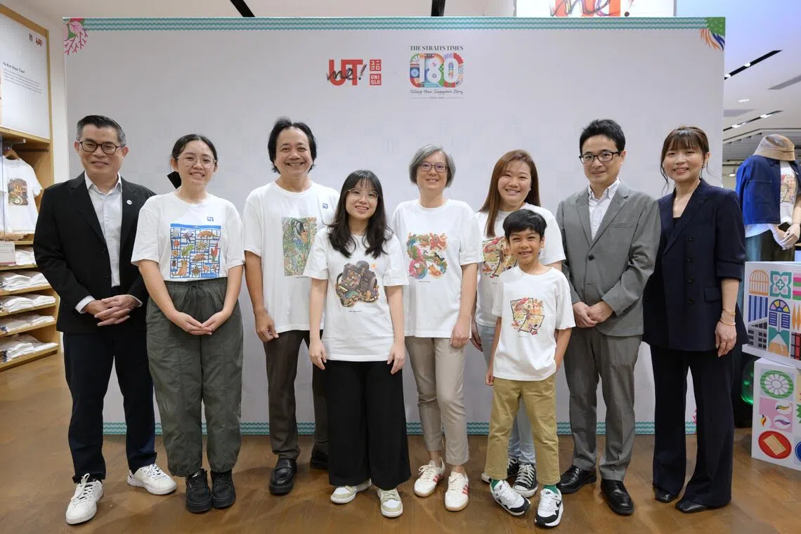 (From left) The Straits Times editor Jaime Ho and artists Lee Yu Hui and Cel Gulapa; UTme! x ST180 contest winners Justina Low, Sandara Tang and Daphne Ong with Ms Ong's son Luke; Uniqlo Singapore’s chief financial officer Daisuke Hamada, and marketing director Paulene Ong.