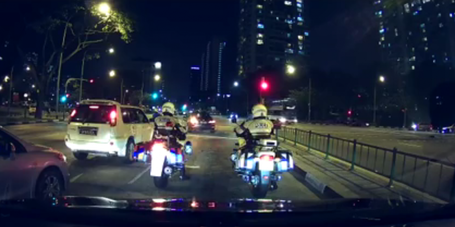 SINGAPORE - A driver was caught on video appearing to beat a red light and cutting across multiple lanes - all in front of two traffic policemen on patrol motorcycles.