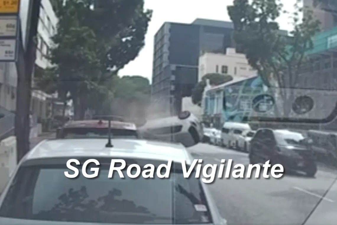 In a video of the accident posted online, a white Volkswagen is seen hitting a vehicle parked on the side of a two-way street in Bras Basah.