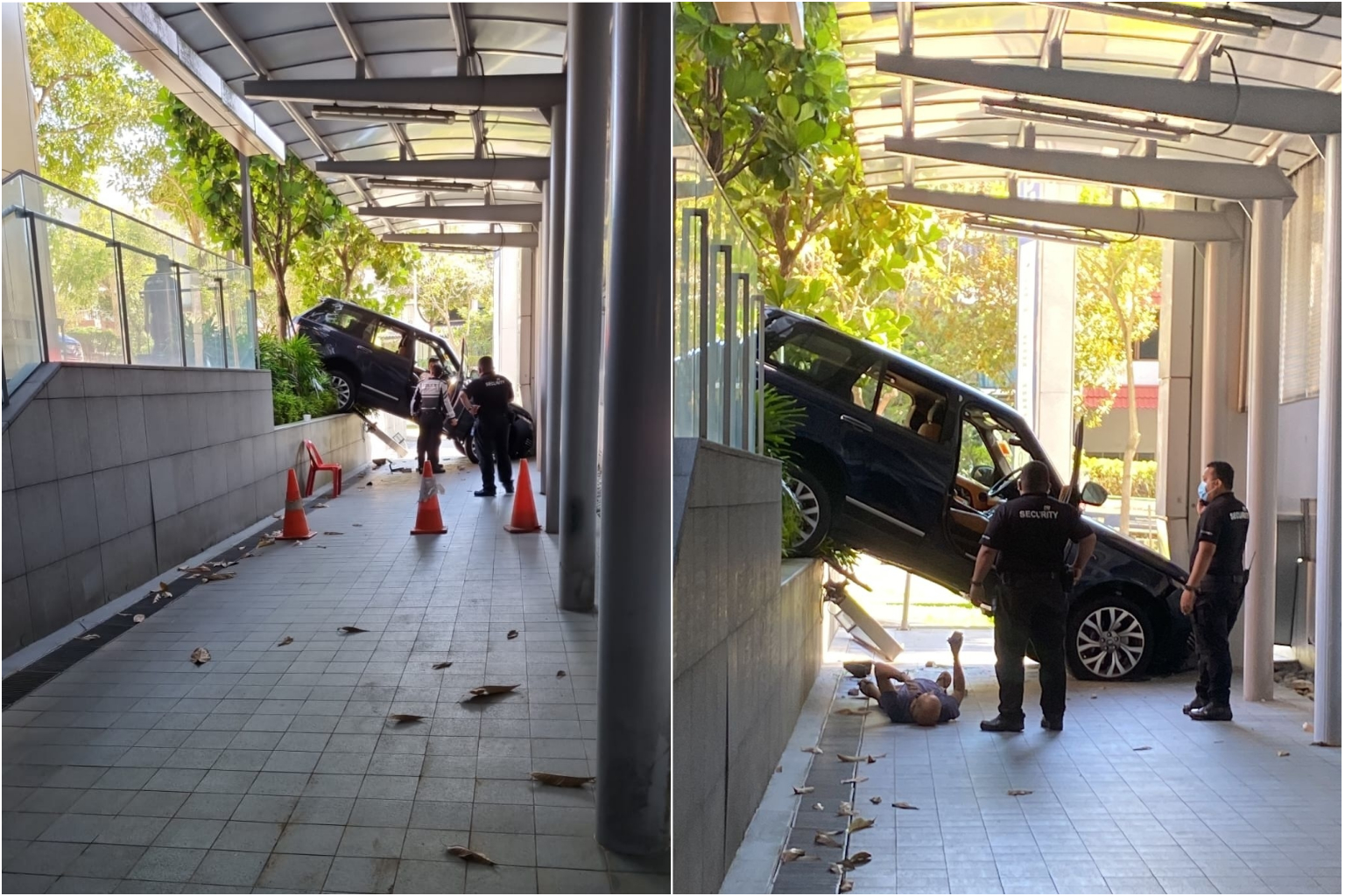 SINGAPORE - The driver of a sport utility vehicle steered so far off Irrawaddy Road in Novena that he ended up diving onto the walkway leading into Royal Square Novena on Sunday morning (June 26).