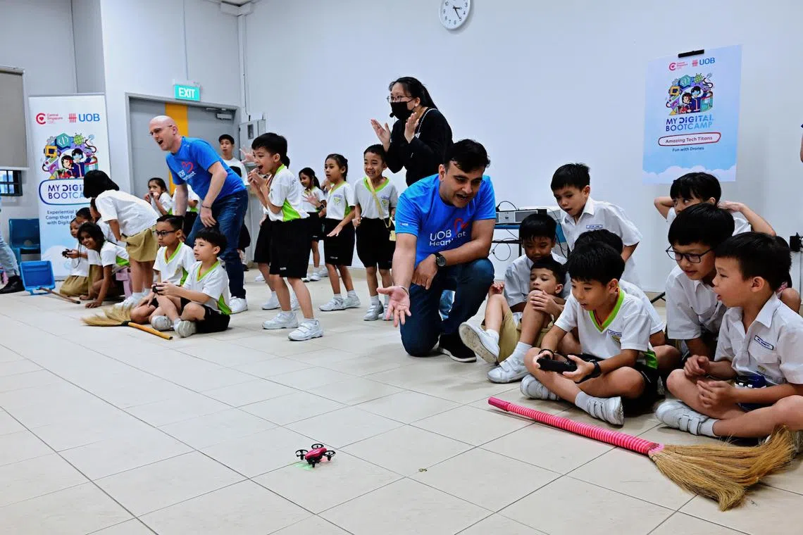 UOB volunteer Vikrant Sharma (left) guiding students from Sengkang Green Primary School in operating mini drones at the half-day workshop held after school.