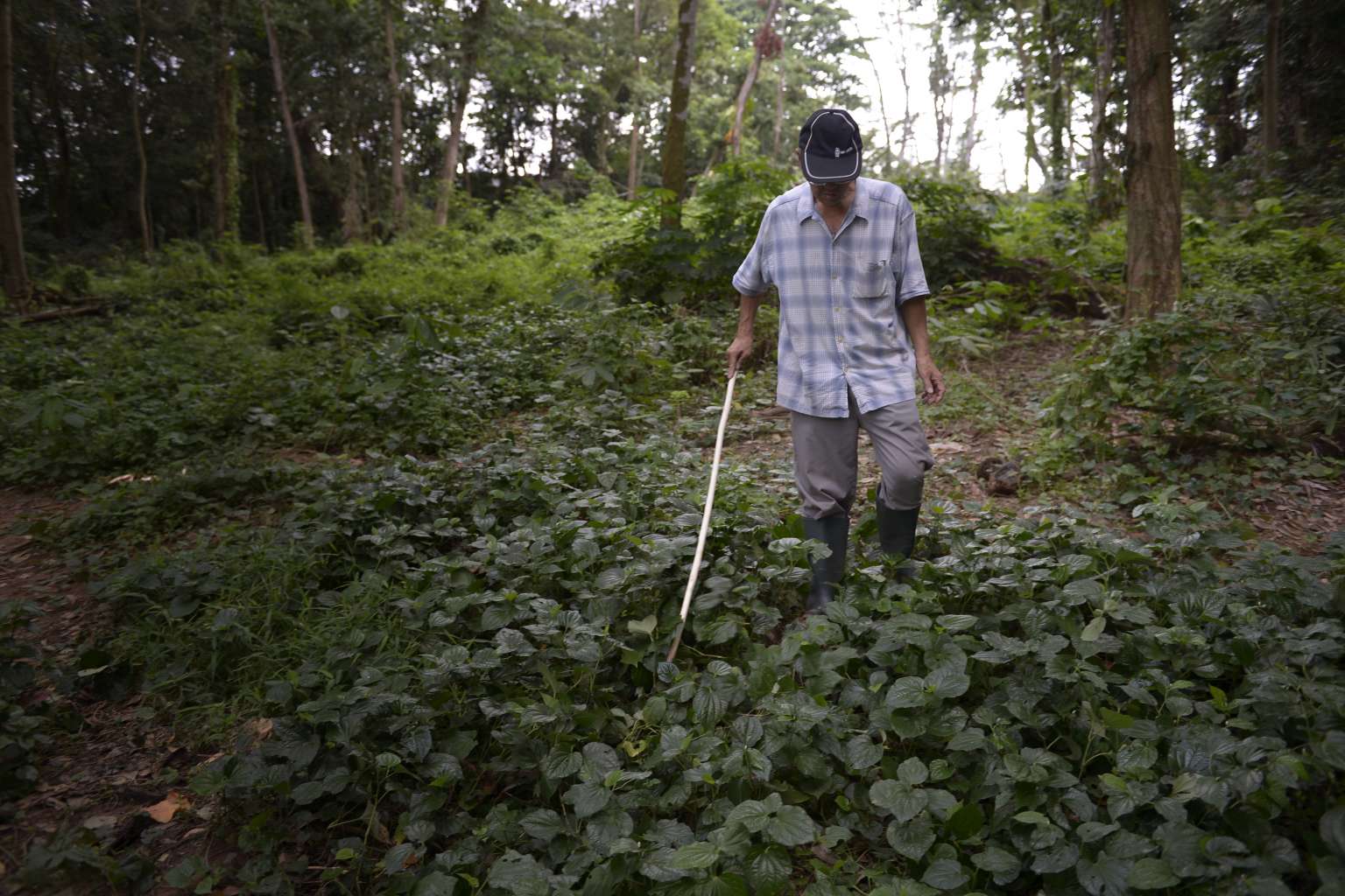 He prods the dense undergrowth with a broken branch while taking each step like a hunter on the prowl. Every so often he stops, looks up and sniffs the air.