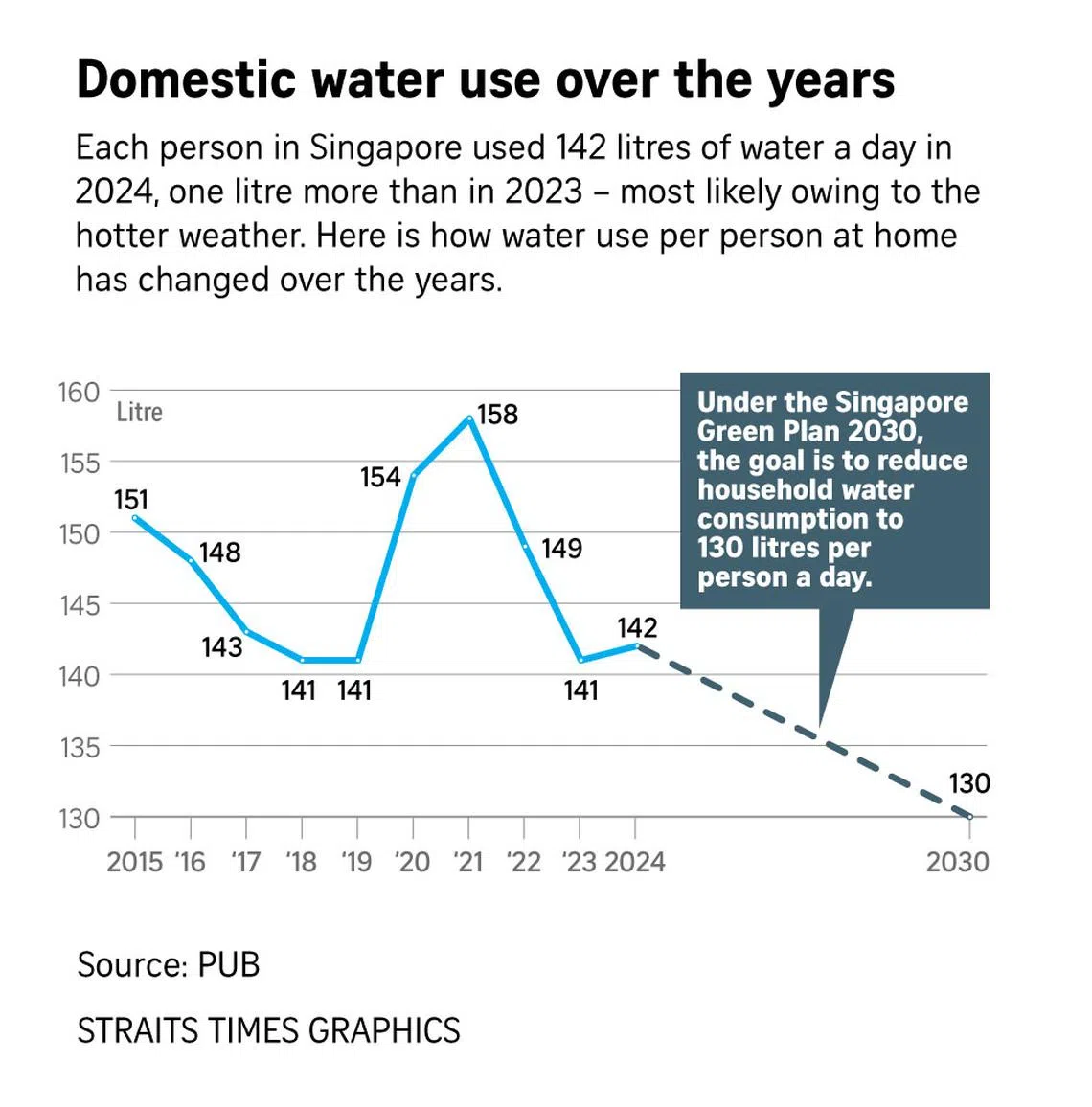 SINGAPORE – In 2024, household water consumption crept up slightly, with each resident using 142 litres of water a day, up from 141 litres in 2023.