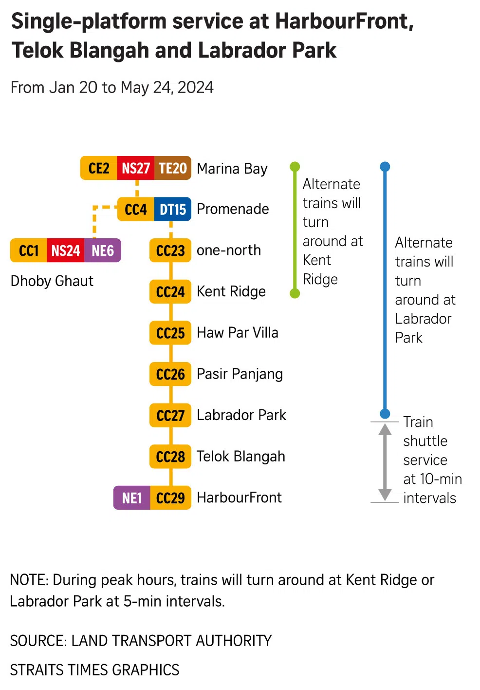 Separately, instead of turning around at HarbourFront, CCL trains will do so alternately at Kent Ridge and Labrador Park to maintain peak-hour intervals at the busy stretch from Kent Ridge to Paya Lebar.