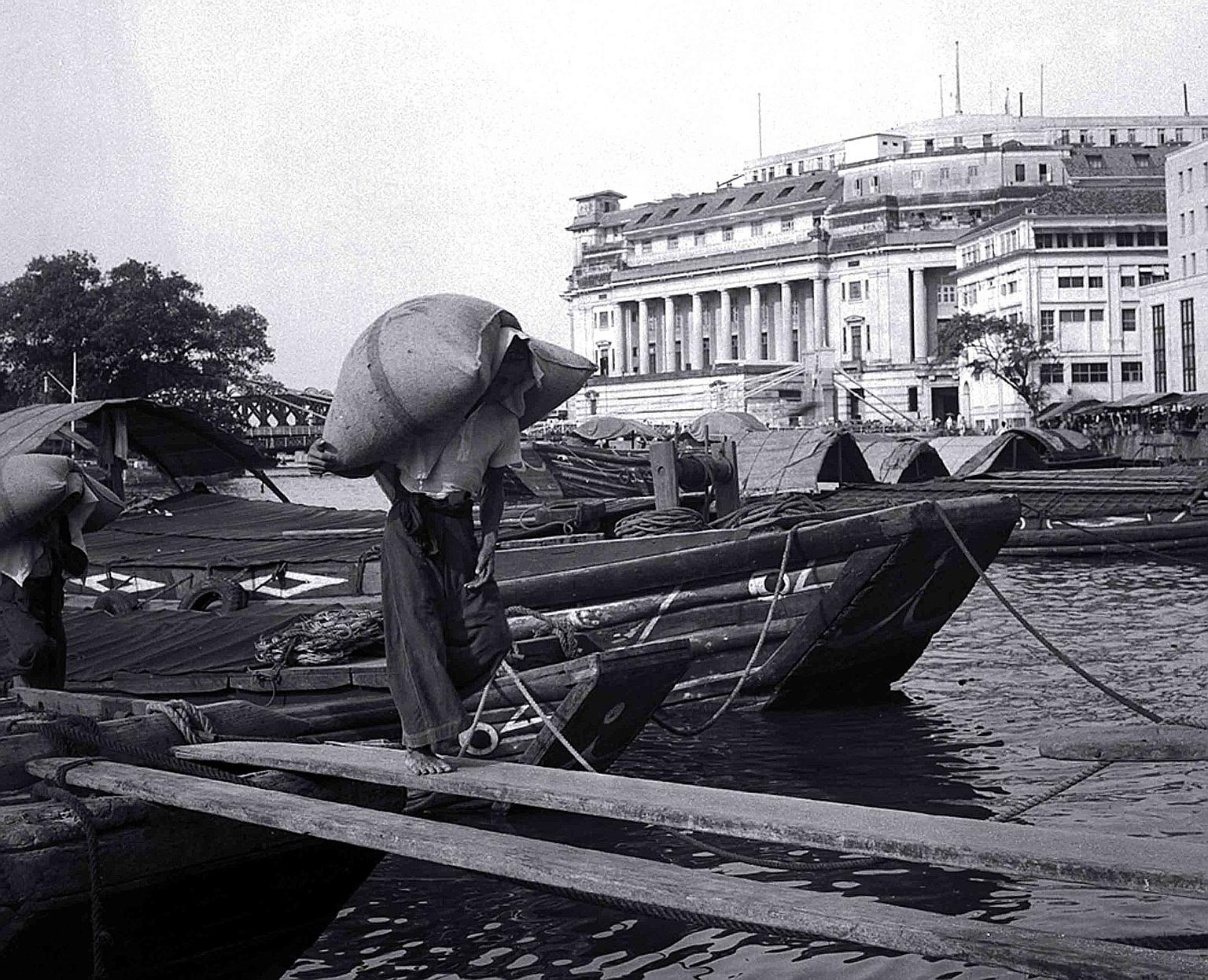 Picture This: A worker carries a bag of rice from a barge at Boat Quay on Aug 1, 1956