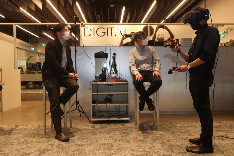 Education Minister Lawrence Wong (left) observing an AR/VR demonstration at Singapore Polytechnic on Aug 27, 2020.