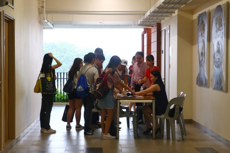 Affected Hwa Chong Institution students check their names against a register before attending a briefing, on Feb 23, 2018.