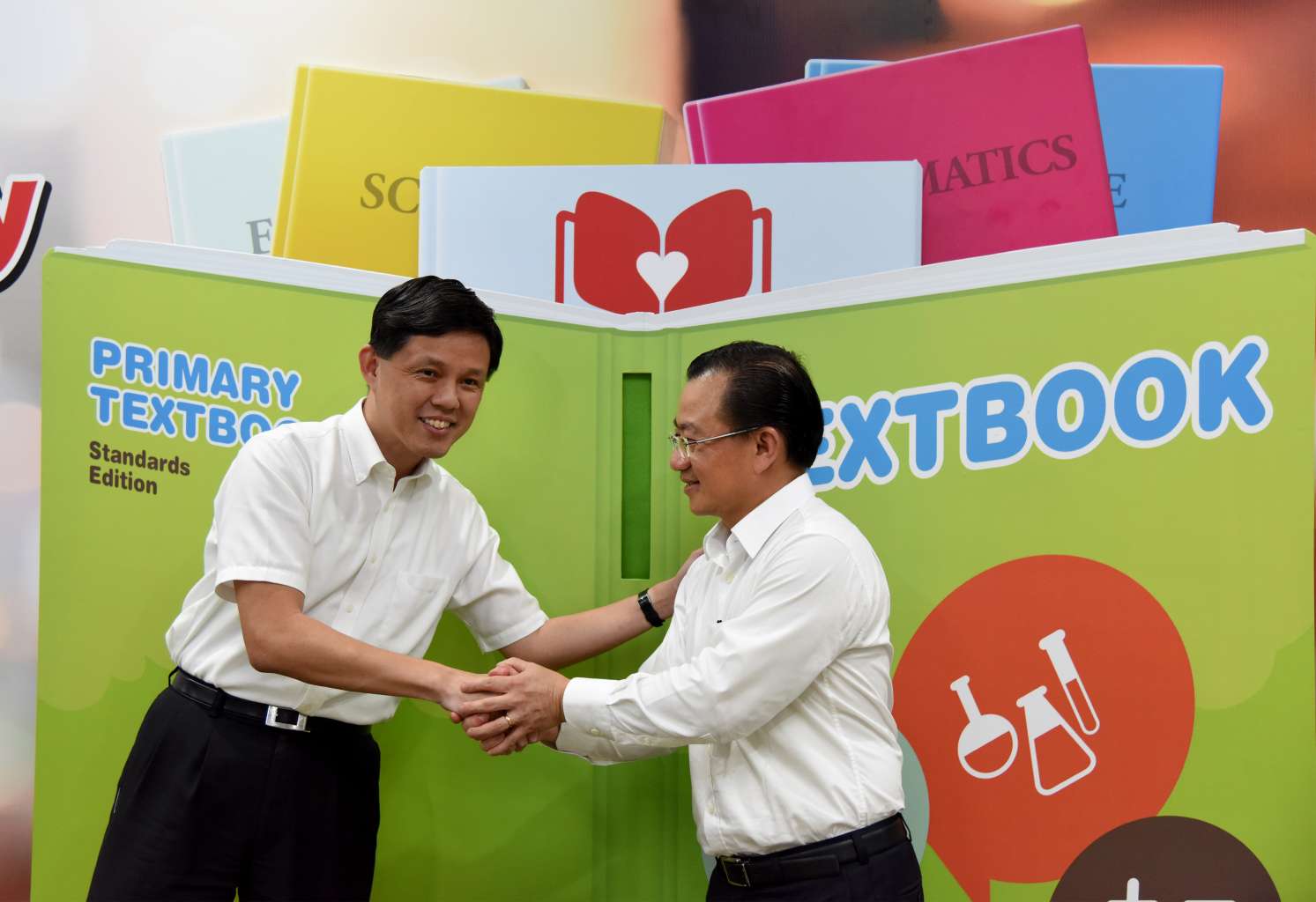 Mr Seah Kian Peng (right), CEO of NTUC FairPrice and Mr Chan Chun Sing, Secretary-General for NTUC and Minister for Prime Minister's Office at the launch of FairPrice's 33rd Share-A-Textbook Project on Nov 16, 2015.