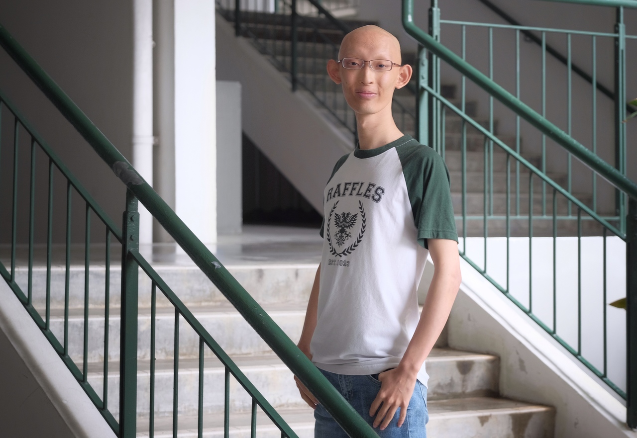 Raffles Institution student Loh Yih Hang has no sweat glands and minimal salivary glands. The 18-year-old looks older than he is, with no hair and missing teeth.