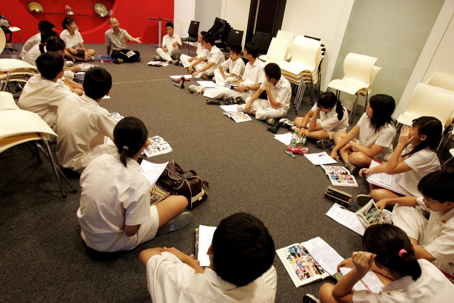 Students in the Victoria Junior College Integrated Programme having a discussion.