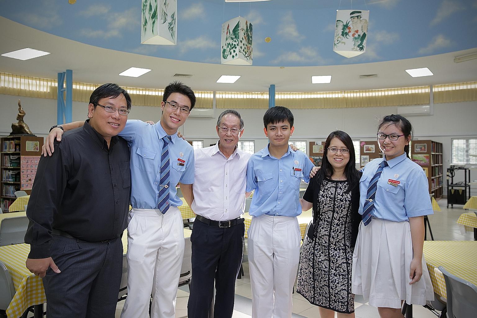 Former student Philip Wu benefited from his school teachers, including Mr Lau Cheong Wong. He now gives back and opens his firm to his juniors for holiday internships. (From left) Mr Wu, student Ong Qing Zhe, Mr Lau, student Vincent Liew, principal Wong Yu Yuh and student Waynie Lee.