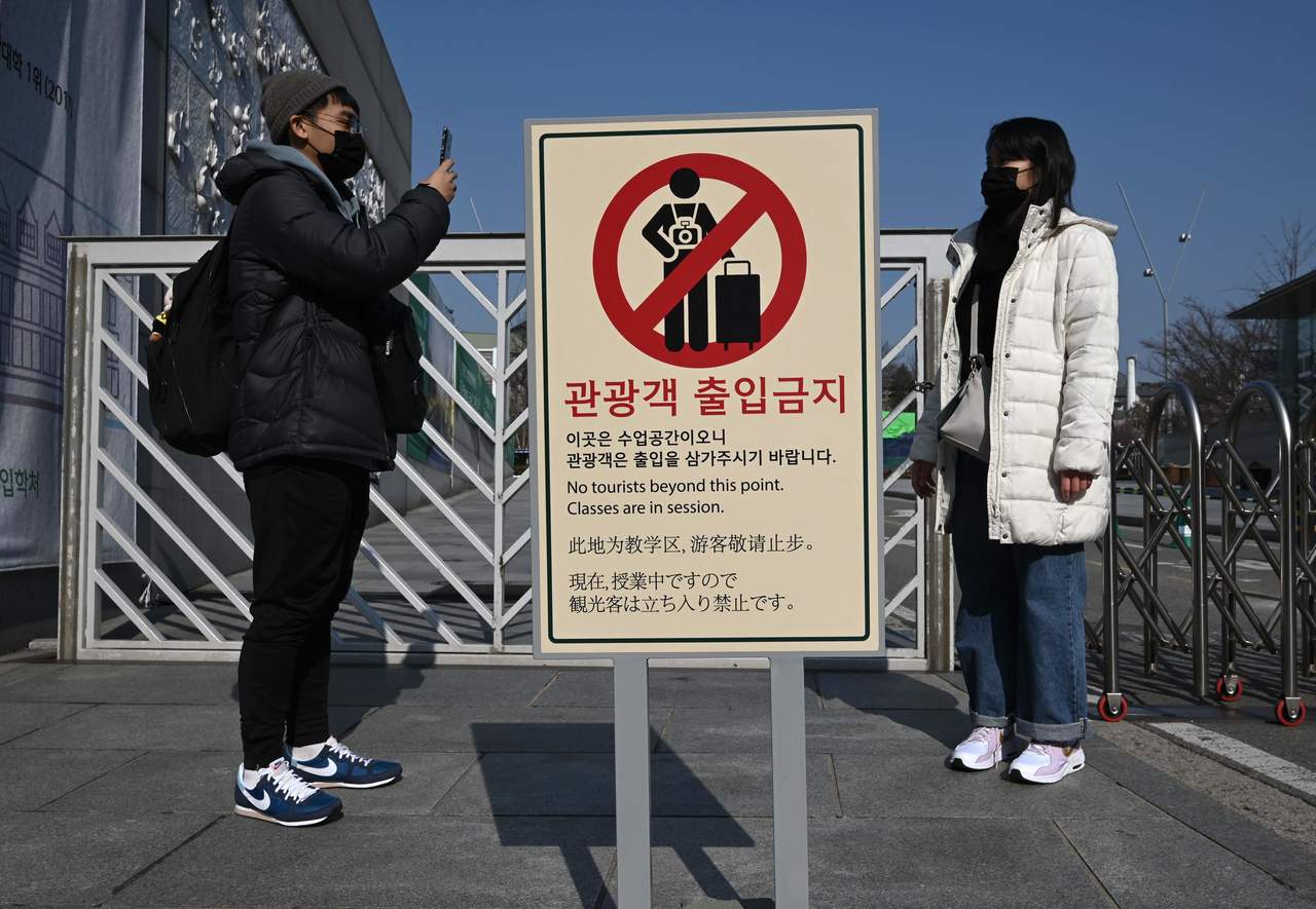 People wearing face masks take a photo next to a "no tourists" sign at the main entrance of a university in Seoul on Feb 4, 2020.