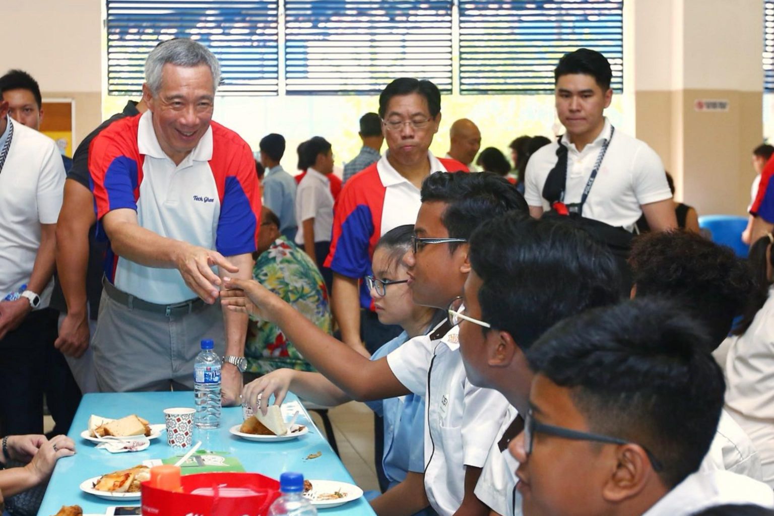 Prime Minister Lee Hsien Loong mingles with students who have just received the Teck Ghee CCC Bursary and Edusave Awards at Townsville Primary School.