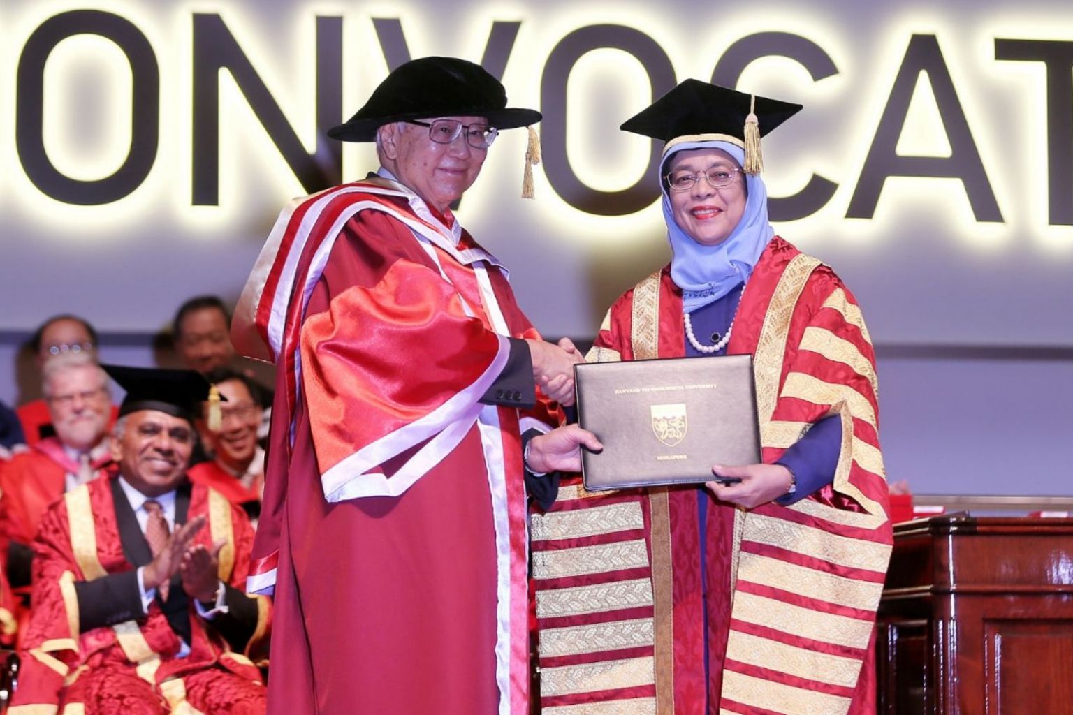 Former president Tony Tan Keng Yam receiving the honorary degree from President Halimah Yacob during the NTU Convocation ceremony on July 24, 2018.