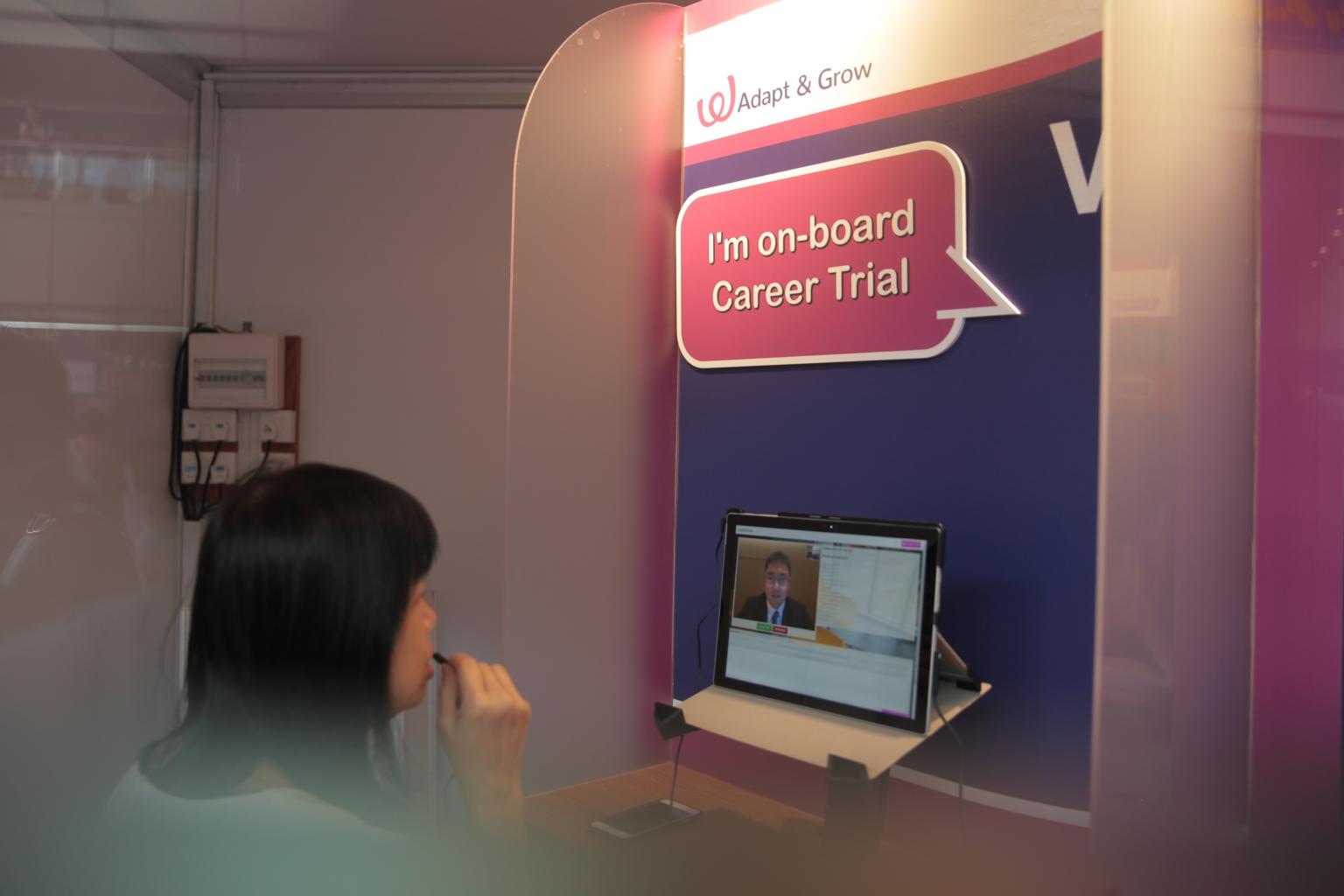 A job-seeker during a video interview at the Adapt and Grow Career Fair at the HDB Hub on July 2, 2019.