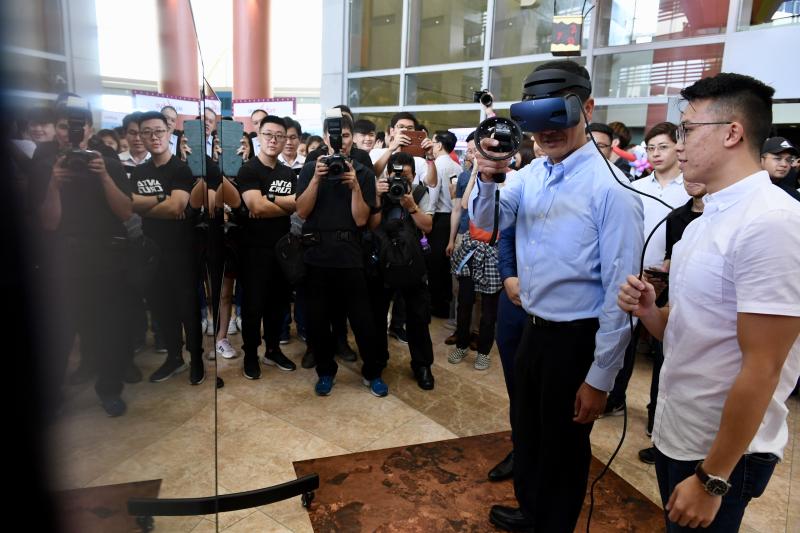 Education Minister Ong Ye Kung tries out a virtual reality project in Nanyang Polytechnic. He’s guided by SkillsFuture Earn and Learn Programme student Brian Koh.
