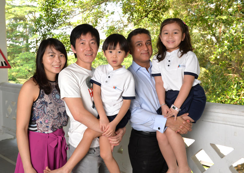 Mrs Emily Wong and Mr Matthew Wong with their five-year-old son Isaiah, along with Mr Sonny Panesar and his six-year-old daughter Akina. Isaiah and Akina attend Gate Junior in Dempsey, a learning centre for children with high IQ.