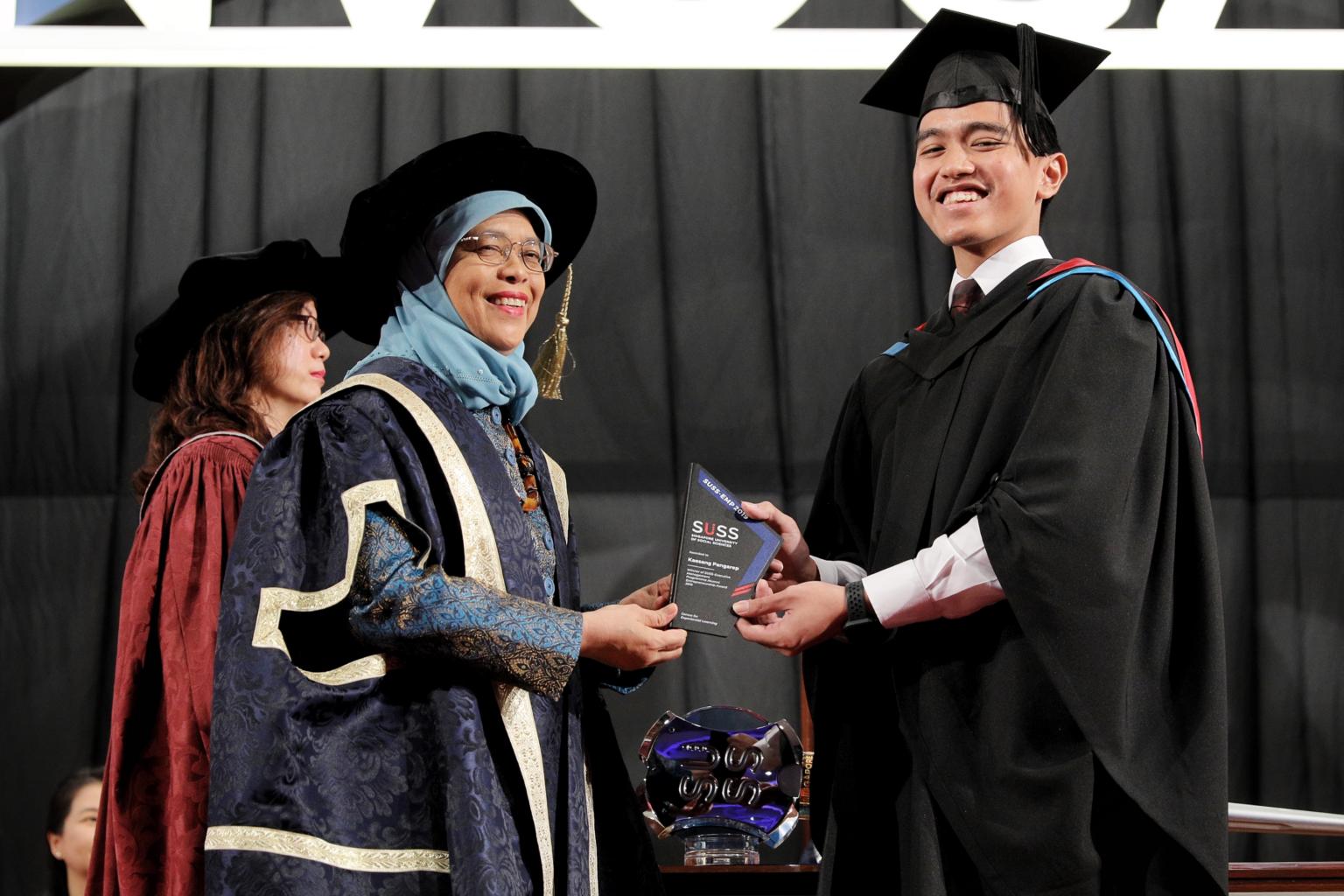 Kaesang Pangarep, youngest son of Indonesia President Joko Widodo, receives the SUSS-EMP Alumni Entrepreneurship Award from President Halimah Yacob at the SUSS Graduation Ceremony on Oct 9, 2019.