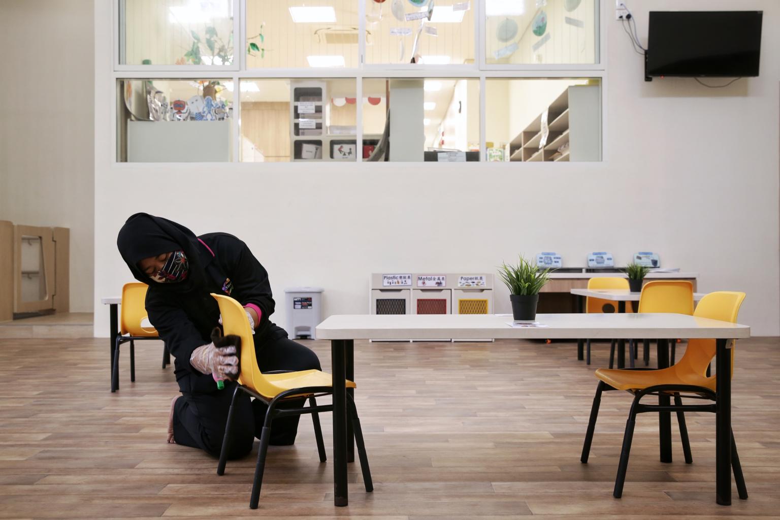 Centre attendant Erni Marlina, 37, disinfecting chairs and tables in My First Skool at 50 Sengkang West Way on May 27, 2020.