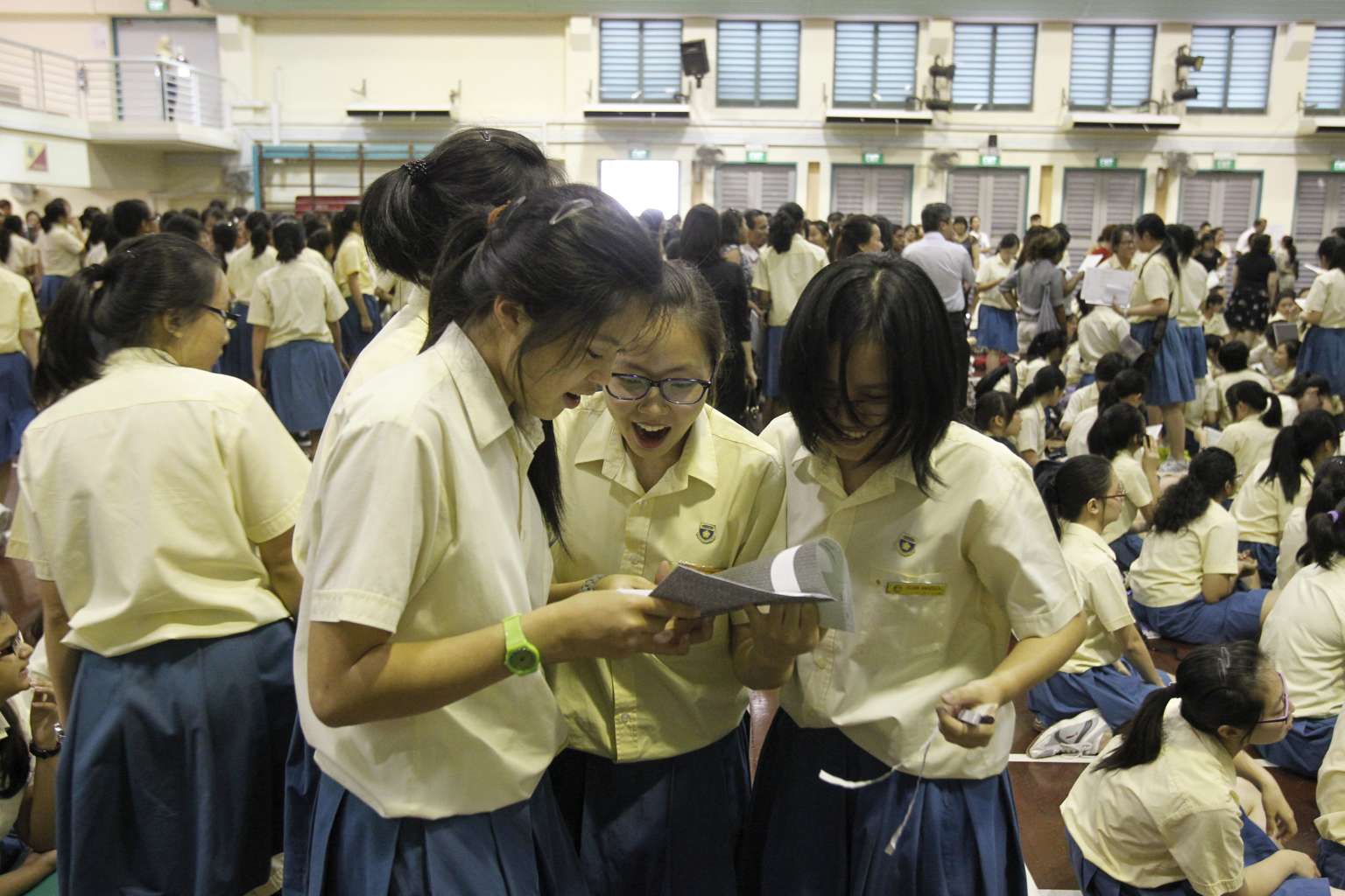 Students at Crescent Girls’ Secondary School checking out one another’s O-level results.