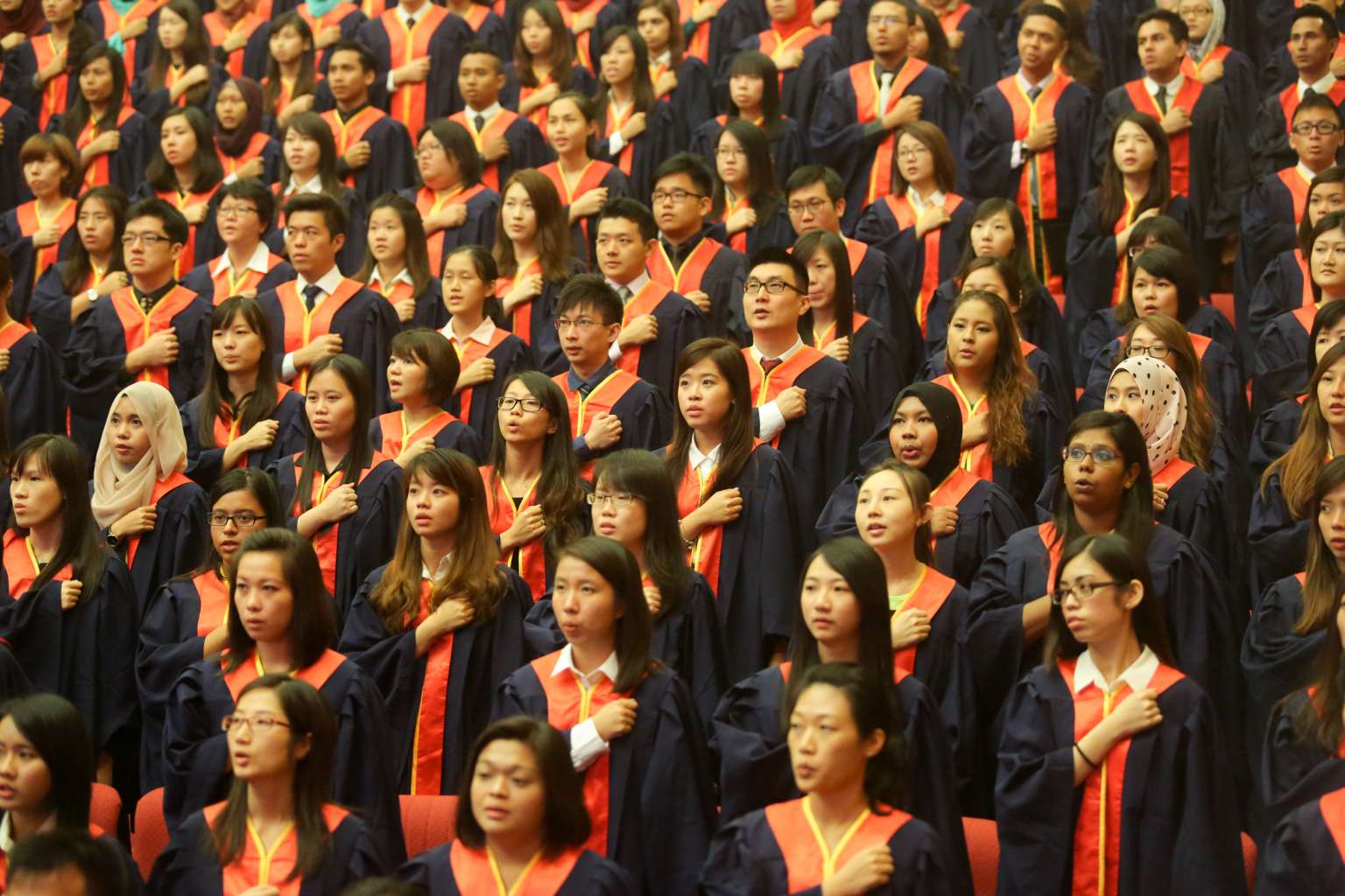NIE graduates reciting the teacher's pledge during a graduation ceremony.