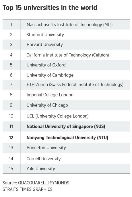 He added: "The other great story here is that Singapore is home to two universities in the top 12. We should be very proud that Singapore is punching well above its weight."