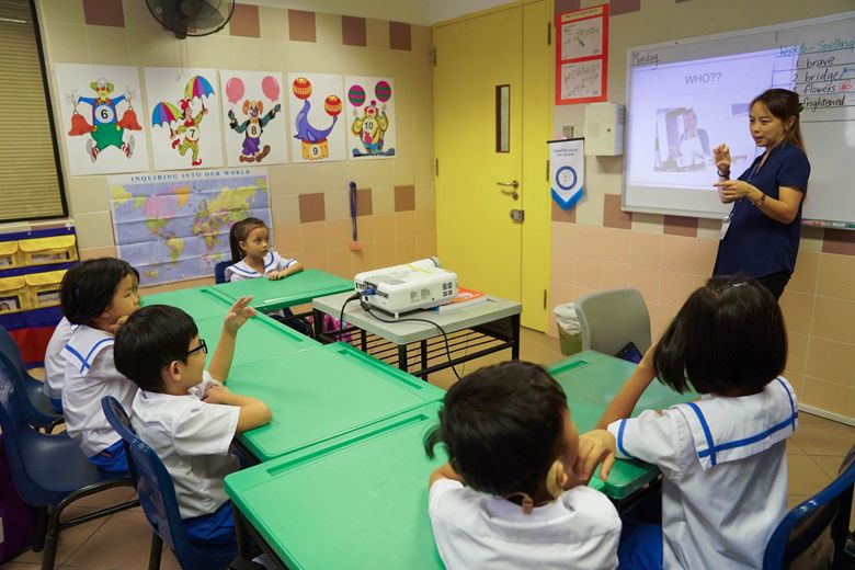 Mrs Janice Lim, one of the two specialised teachers at Mayflower Primary School, teaching sign language to a group of six children with hearing loss. Mayflower Primary uses sign language as the medium of teaching for pupils with hearing loss.