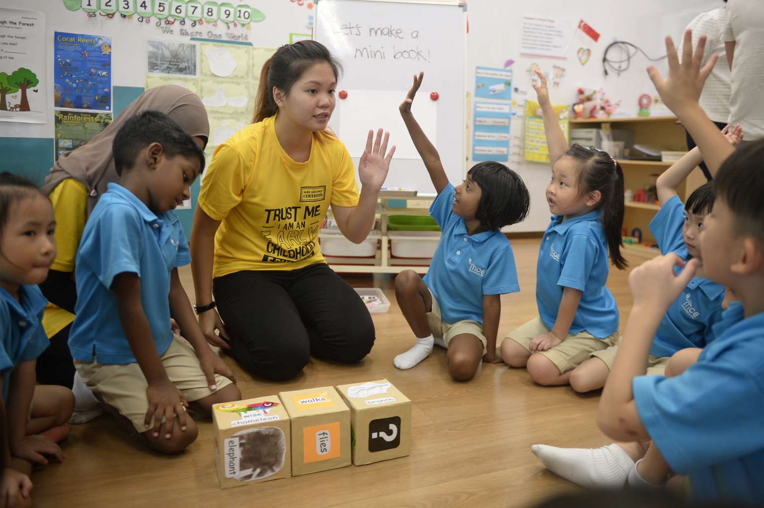 NP Child Psychology and Early Education student Eden Yeong, 19, playing a game of word dice with children at the MOE Kindergarten at Dazhong Primary.